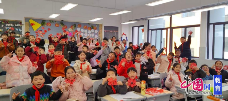 四年级教室剪刀声此起彼伏,孩子们巧手剪裁红纸,创作出兔子吃胡萝卜、带爱心的雪花等精致窗花。阳光透过窗花洒在黑板上,教室暖意浓浓。