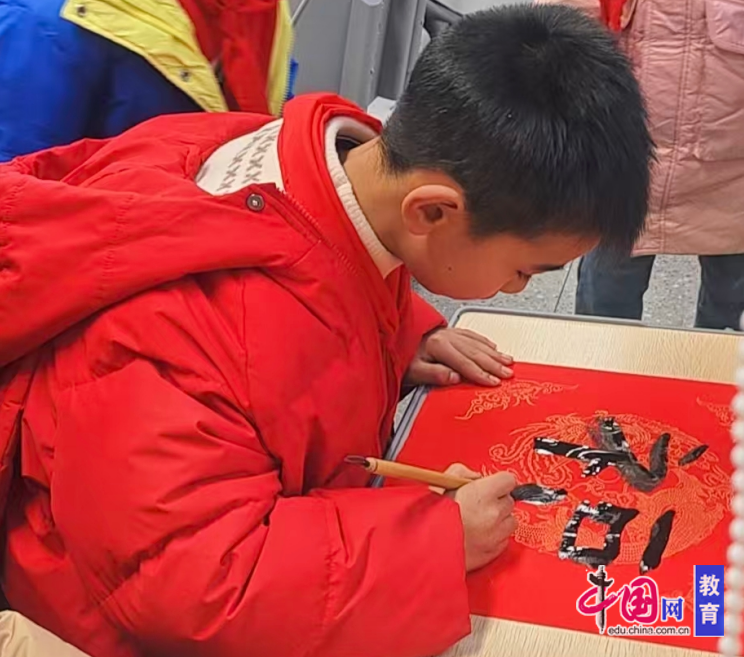 二年级教室洋溢着福气,孩子们躬身书写“福”字,红纸上的墨痕徐徐晕开。尽管笔画稚嫩,却各具特色,老师寄语,每一个“福”字都承载着孩子们的真挚心愿。