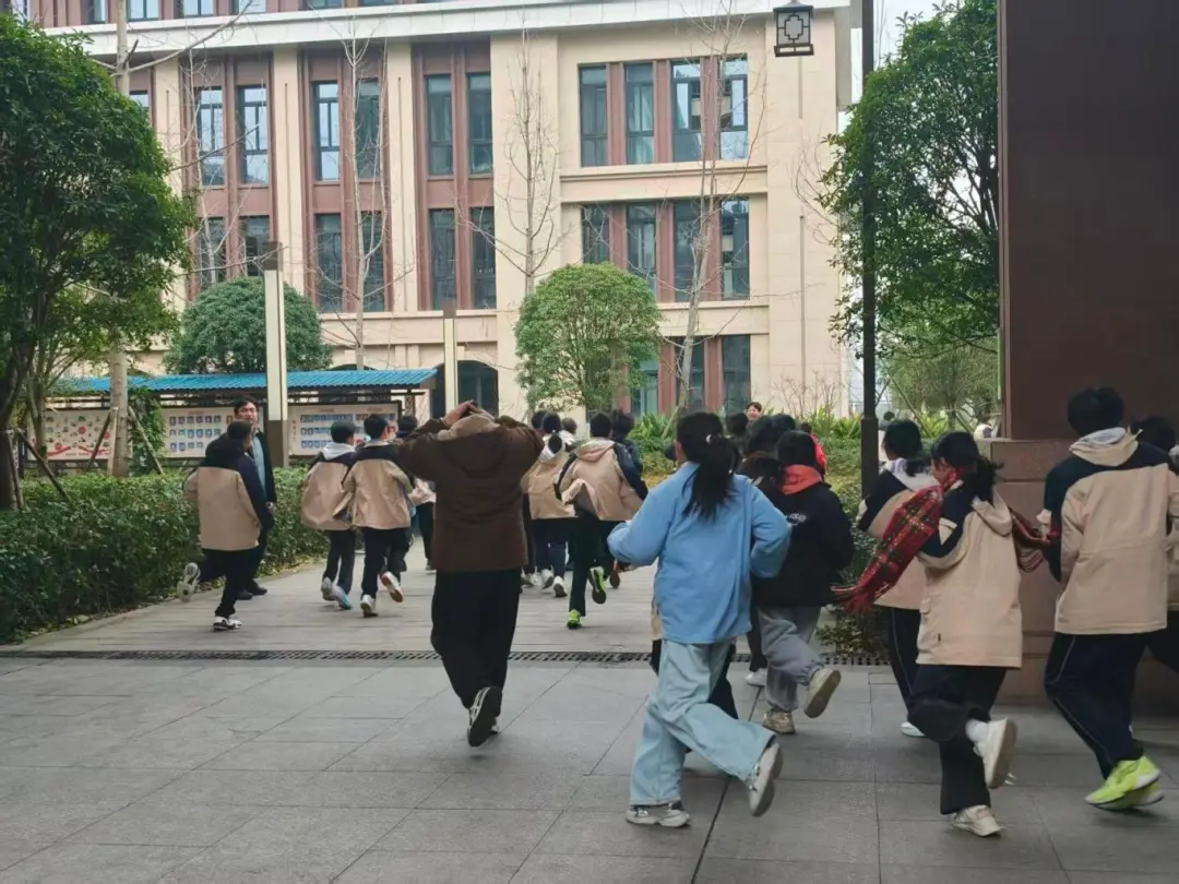 下午4:10,演练接力至滨江校区。全体师生同样以高度的纪律性和规范性完成了全部演练环节。从避险到疏散,从清点到集结,师生配合默契、动作标准,在极短时间内全员安全抵达指定集结地点,充分展现了应急安全教育的扎实成果。