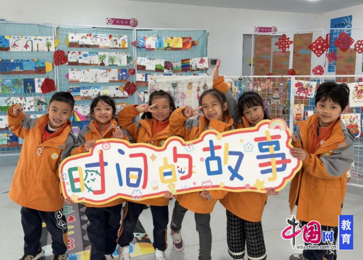 在金沙小学D区“时间的故事”美术画展现场,孩子们用画笔与创意编织出独属于自己的时间童话。展厅里,拼贴的四季画卷勾勒出春生夏长、秋收冬藏的时光轨迹,红彤彤的剪纸窗花晕染着节日的时间氛围,还有充满童趣的生肖马绘、五彩的指纹拓印长卷,将抽象的时间化作可触可感的色彩与线条。孩子们或围站在作品前指着画面分享创作灵感,或举着“时间的故事”手牌露出灿烂笑容,每一幅作品都是他们对时间的观察与想象,稚嫩的笔触里藏着对岁月流转的好奇,也让这场画展成为孩子们与时间对话的温暖舞台。