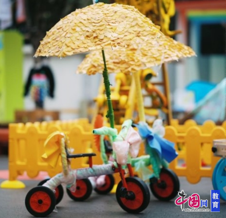 当三轮车、自行车遇上轻盈的布缦,一场属于童年的“花车巡游”便在操场中央缓缓展开。孩子们像魔法师一样,把寻常器械变成童话里的座驾,在创意与协作中学习分享、感受共创。教师作品“自行车山”,则像一双温柔的大手,托举起每个孩子向上攀爬的勇气。在这里,每一次拼接,都是对世界的一次天真告白。
