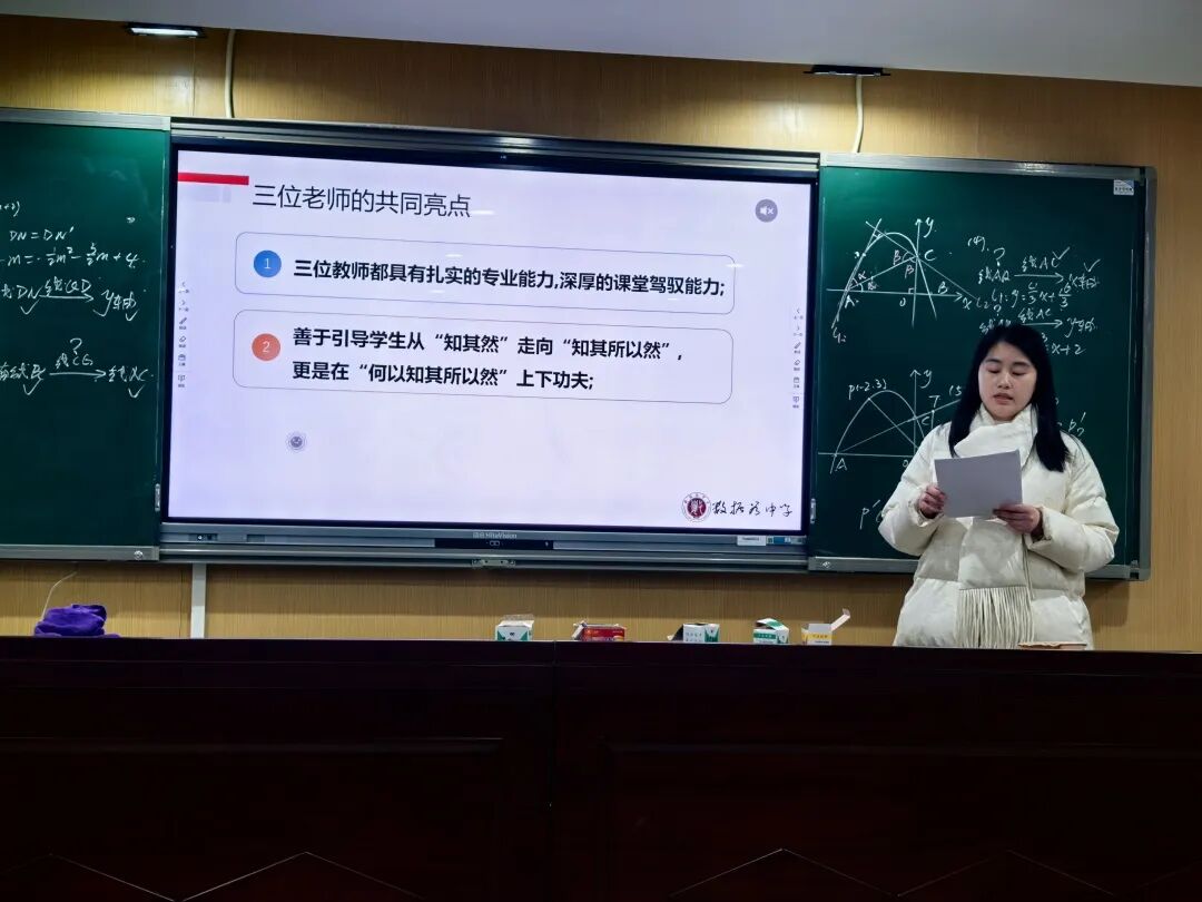 数学组初三教学督导活动于2025年12月29日举行。刘忠雨与涂建华两位教师分别进行了示范授课,展示了习题课中采用一题多解、深入挖掘题目根源的教学方法。在评课交流阶段,初一教师杨玉玲对初三教师在习题课的教学方式表示肯定,并就习题评讲提出了建议。初二教师马秋兰汇总了本年级的听课意见,详细梳理课堂亮点与不足。全体参与教师围绕中考复习准备与学段协同发展的需求展开讨论,全面回顾了初三数学备考进展情况,为不同学段的教学衔接提供支持,并明确了初三阶段教学优化与提升的具体方向。