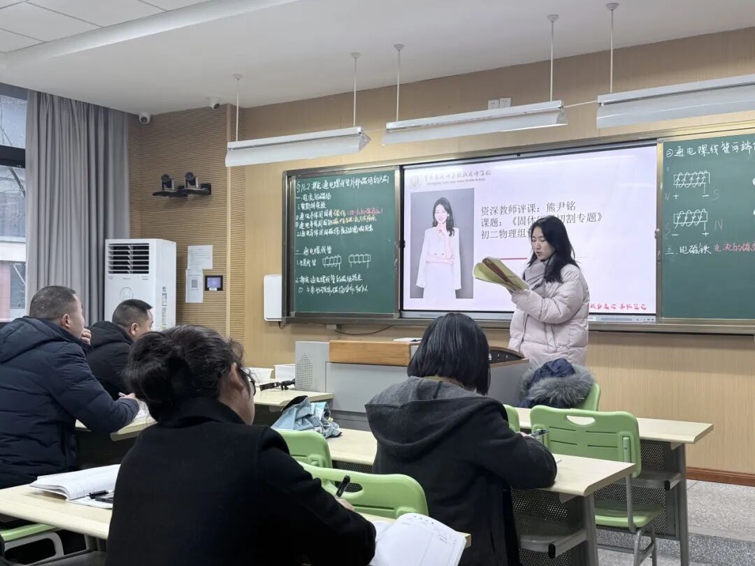 在全员听课阶段,教师们互听互评,以观察者视角审视教学现场,真诚交流意见,梳理课堂真实问题与优化方向。在示范献课环节,舒晨老师执教《固体压强切割专题》,以精妙清晰的板书设计引导学生思维层层深入;牟秋蓉老师带来《通电螺线管外部磁场方向》教学,通过生动有趣的实验探究让物理规律自然浮现。课后,献课教师深入说课,分享教学设计思路与实施心得;熊尹铭老师、代汝奎老师从目标达成、学生参与、思维建构等维度专业评课,提出中肯建议;初二年级教学组长黄玉洁老师梳理听课情况,分析典型问题,提出“简单问题略讲,复杂问题慢讲精讲”“构建逻辑清晰的课堂问题链”“提升学生思维参与度”“促进生活情境向物理模型转化”四项改进建议,强调初二科学思维培养与实验探究规范;青年教师谭云泰分享听课收获与反思,体现了新生力量的学习热情与成长自觉;代汝奎老师作总结展望,鼓励全体教师以此次教研为新的起点,持续深耕课堂,将诊断中的思考转化为教学行为的具体改进,在协作共享中推动学校物理教学品质的整体提升。