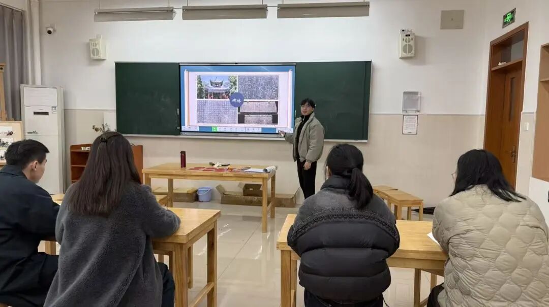 示范教学环节,贺金开老师执教《惟妙惟肖——中国工笔人物画》,以宋代《八十七神仙卷》局部临摹为例,分步演示“白描勾线”“三矾九染”等核心技法,让学生亲手体验中锋用笔力度控制与矿物颜料层层渲染;李晓燕老师面向初一年级上册学生带来《雕梁画栋——中国古建筑》,通过“情境导入—探究认知—实践感悟—总结升华”四环节,结合文本与实物素材,培养学生对传统建筑装饰艺术的感知力与审美力。专题分享环节,孟凡老师作《诊断报告——校园创美》讲座,基于校园美育调研数据,分析“美的盲区”,展示“走廊画廊”“教室美学角”案例,提出“空间叙事”“参与式设计”等实践策略;青年教师王庆瑞分享《心字有灵——笔墨传情》,从“情绪汉字”书写实验出发,介绍书法练习与情感教育融合的教学方法。