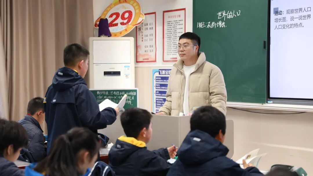 廖怡老师执教《中国的交通运输业》(第一课时),以智利车厘子运往中国杭州为线索,串联交通运输概念、现代交通运输方式特点、运输方式选择、中国交通运输业发展及交通网等知识,课堂图文视频材料丰富,案例贴近生活,还加入相关真题供学生思考。刘宗学老师讲授《世界的人口》,从人口增长曲线切入,通过“水缸模型”阐释出生率与死亡率的动态平衡,简化自然增长率计算;设置分组讨论环节,让学生围绕人口增长过快或过慢的社会问题,结合韩国老龄化、日本少子化等案例探究破局之策,课堂图文并茂、互动活跃。课后,刘宗学老师分享骨干教师诊断报告,青年教师代表吴欣交流听课学习报告。