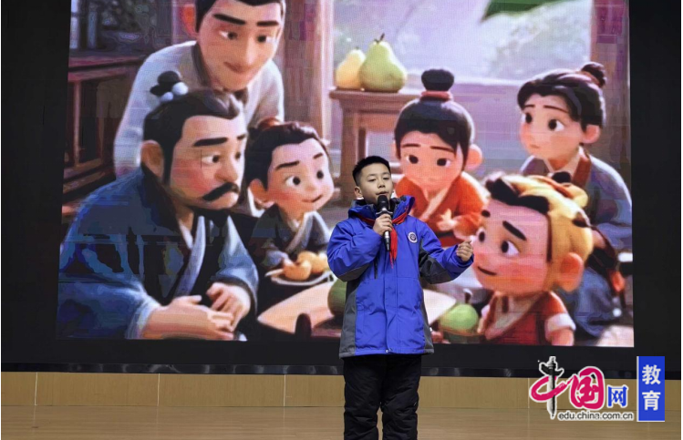 五六年级的学子们以英语为桥,让中国故事跨越语言的边界。舞台上,他们身着贴合角色的服饰,手持精心制作的道具,用流利纯正的语音语调,将一个个经典故事演绎得绘声绘色。《Sima Guang and the water》的遇事冷静,果断救人在台词之间流转,《少年中国说》呼吁中国少年挣脱束缚、奋发图强,肩负起建设强盛国家的重任,字里行间满溢着强烈的爱国情怀与民族自豪感,《Mulan Joins the Army》赞扬巾帼不让须眉的勇气与担当,打破“女子不如男”的刻板印象,展现女性的坚毅、果敢与家国情怀。更有学子将汉服文化、传统节气等元素融入讲述,以独特视角诠释文化内涵。
