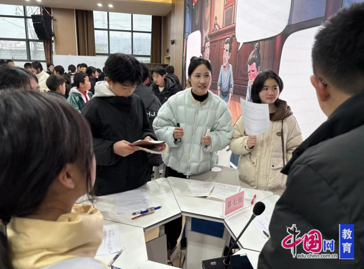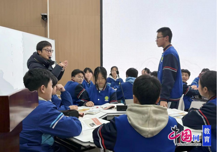 宜宾市八中赵沿超老师执教语文课《穿井得一人》,以“流言案”为线索,通过“预学—探究—建构—拓展”的教学环节,引导学生梳理情节、品析语言,理解寓言寓意,并结合现实探讨信息传播的理性态度,充分体现“学为中心、素养导向”的“新三线四环”教学模式。