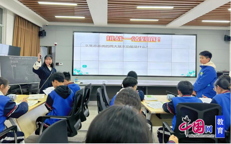 棠湖学校王祥芮老师则呈现了一节富有乡土情怀的生物复习课《探秘三江之畔,守护宜宾生态》。课程以宜宾本地生态视频导入,围绕长江生态系统、“十年禁渔”等真实案例展开合作探究,引导学生在分析食物链、探讨生态保护策略中整合知识,生动体现了棠湖“幸福课堂”五环节与五维度的育人理念。