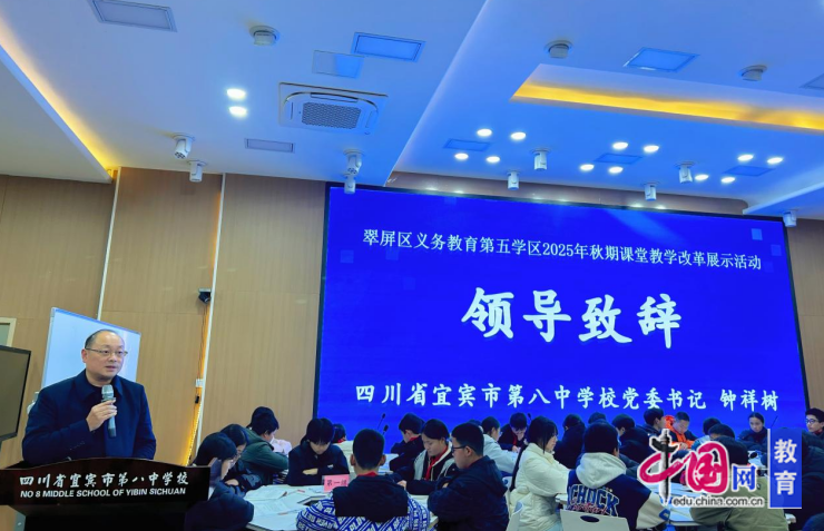 活动在宜宾市八中党委书记钟祥树的致辞中拉开序幕。钟祥树指出,当前教育正处在深化改革、高质量发展的关键时期,推动课堂教学改革是落实立德树人根本任务、发展学生核心素养的必然要求。他强调,本次活动旨在实现三个目标:搭建展示成果、共享智慧的交流平台;凝聚深化课改、协同共进的学区共识;推动教学反思与行动优化的真实实践。他鼓励全体教师在观课、议课中深入思考,将启发转化为课堂实践,共同为推动第五学区教育高质量发展贡献力量。