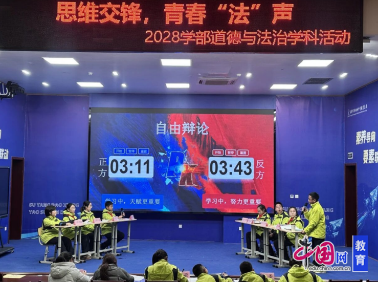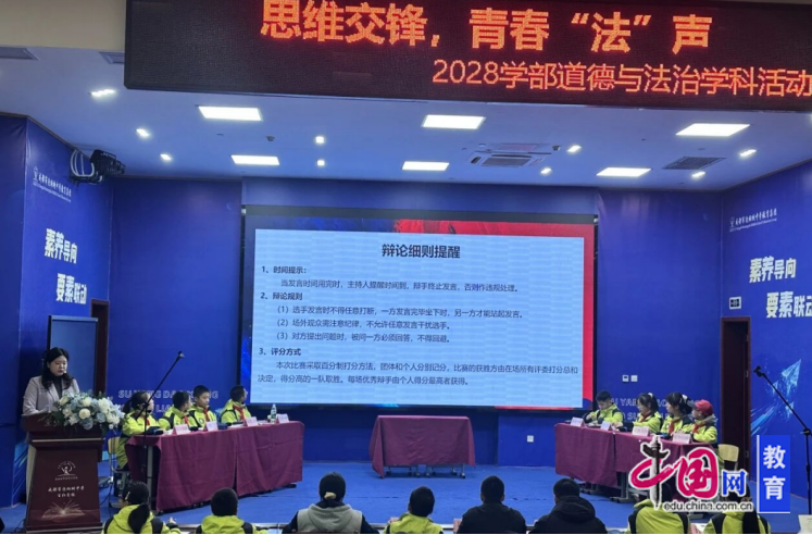 思维交锋,青春“法”声。为落实立德树人根本任务,在思辨中培育学生核心素养,增强法治意识与价值判断力,成都市泡桐树中学百仁分校2028学部道德与法治学科组于近日举办了“思维交锋,青春‘法’声”班级辩论赛。本次活动以全员参与、班班对战的形式展开,不仅是一场语言的较量,更是一次思维的深度碰撞与青春的理性表达。