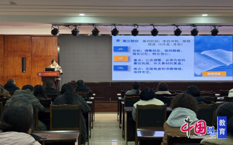 学校课程发展中心主任杨鹏作高三第三学月成绩分析汇报:服装专业涨幅最大(78.46%),材料、旅游专业稳步提升。杨鹏精准剖析各班级、各科目得分率,提出“紧抓苗子生引领学风、深研考纲明确重点、强化家校与学法指导”三大建议,为复习工作精准导航。