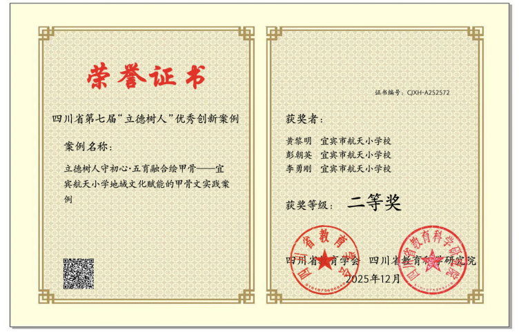 《立德树人守初心,五育融合绘甲骨——宜宾市航天小学地域文化赋能的甲骨文实践案例》,深挖地域文化与五育融合的结合点,以独特的育人视角荣获二等奖;《用心浇灌,用爱助力,五育并举育新苗》聚焦学生全面发展的落地路径,获评三等奖。