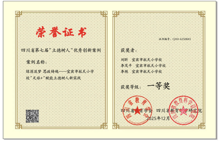 在此次评选中,《绿茵筑梦 思政铸魂——宜宾市航天小学校“足球+”赋能立德树人新实践》以及《以习惯育人为基 筑立德树人之魂》两大案例,凭借鲜明的实践特色、系统的育人设计和显著的实施成效,双双获评一等奖。