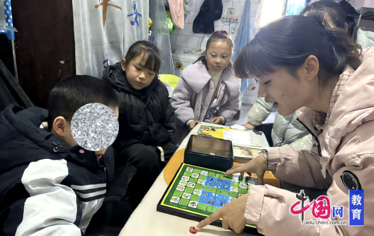 送教临近尾声时,该学生主动邀请晴晴和漫漫一起玩斗兽棋。起初两位小志愿者还不熟悉规则,该学生便耐心讲解、亲自示范,颇有小老师的风范,随后几个小朋友展开了轻松愉快的“对决”。棋盘上你来我往,笑声阵阵,孩子们在游戏中自然交融,温暖流淌。