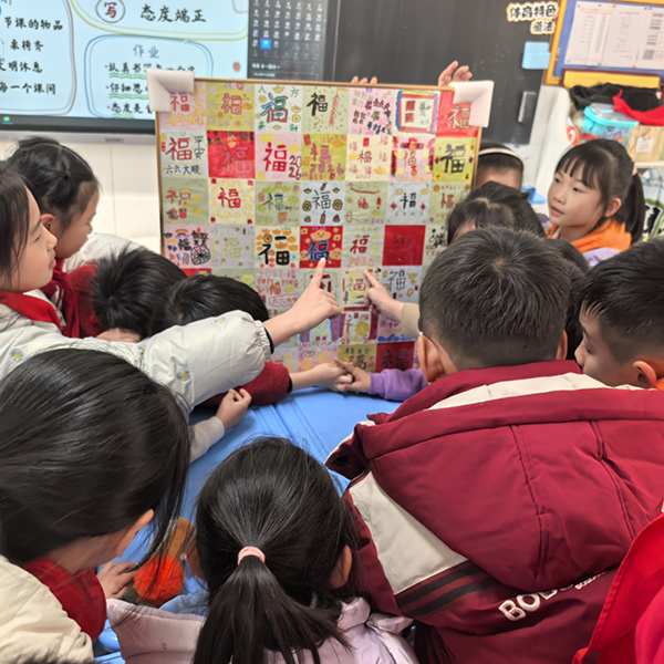 当同学们将风格各异的福字作品拼合成一幅完整的“百福图”时,同学们纷纷围上前,指着自己的作品欢呼雀跃。色彩斑斓的画面里,不仅有传统的红金配色,还点缀着同学们手绘的灯笼、红包、花朵等吉祥图案,一笔一划都承载着对新年的美好憧憬。