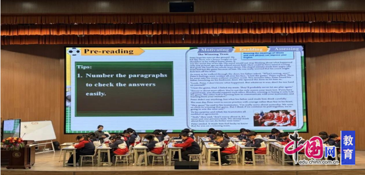 随后,来自盐亭华宸英才学校李双老师展示了一堂精彩纷呈的九年级阅读教学示范课,教学内容为Unit 9 “The Winning Team”。这堂课以POA理论为架构,清晰地呈现了“驱动(Motivating)—促成(Enabling)—评价(Assessing)”这一教学循环。李双借助创设真实的情境,激发学生的共情能力,引导学生在协助同伴解决问题的过程中积累语言素材,达成了“学用一体”的设计初衷。李双以富有挑战性的产出任务为“驱动”,引领学生明确学习目标;在“促成”阶段,通过搭建精准的支架,有机整合输入性学习材料,助力学生逐步掌握完成产出任务所需的内容、语言和结构;最后通过多元化的“评价”,关注学生的产出成果与过程表现。本节课成功地将POA“学习中心”“学用一体”的核心原则,转化为可操作、可观察的教学行为,为全县教师提供了“理论融入课堂”的生动范例。