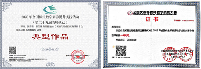 《画法几何虚拟仿真课件》探索将虚拟仿真技术全面融入课堂教学,有效拓宽了该技术在高等教育领域的应用边界,成效显著。此外,该作品还在2025年全国优教杯教师教学技能大赛中荣获课件类一等奖,并在2025年全国优质教育科研成果展评中获得优质课件二等奖。