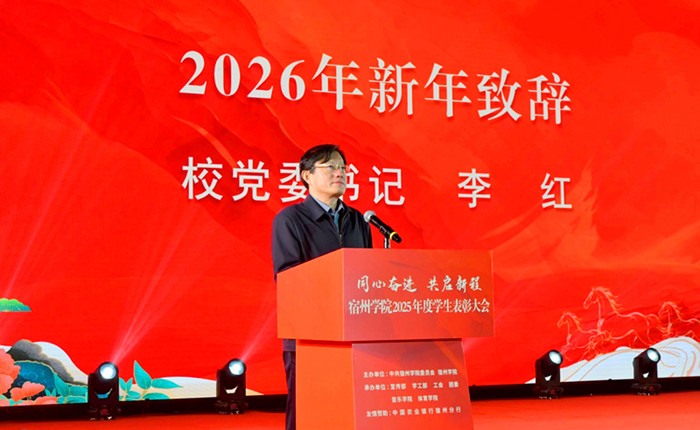 宿州学院党委书记李红致辞,向受到表彰同学致以热烈祝贺。他回顾了2025年学校发展取得的主要成绩,特别是广大学子奋勇拼搏、超越自我、同心筑梦、为校争光,取得的一系列骄人成绩。展望2026年,他寄语全体教职工要牢记为党育人、为国育才的初心使命,树立“躬耕教坛、强国有我”的志向和抱负,大力弘扬教育家精神,把立德树人融入办学治校、教书育人全过程,科学回答好“培养什么人、怎样培养人、为谁培养人”这一核心课题。他寄语广大同学要坚定不移感党恩、听党话、跟党走,胸怀家国、修养品行、拼搏奋进,争做有理想、敢担当、能吃苦、肯奋斗的新时代好青年。
