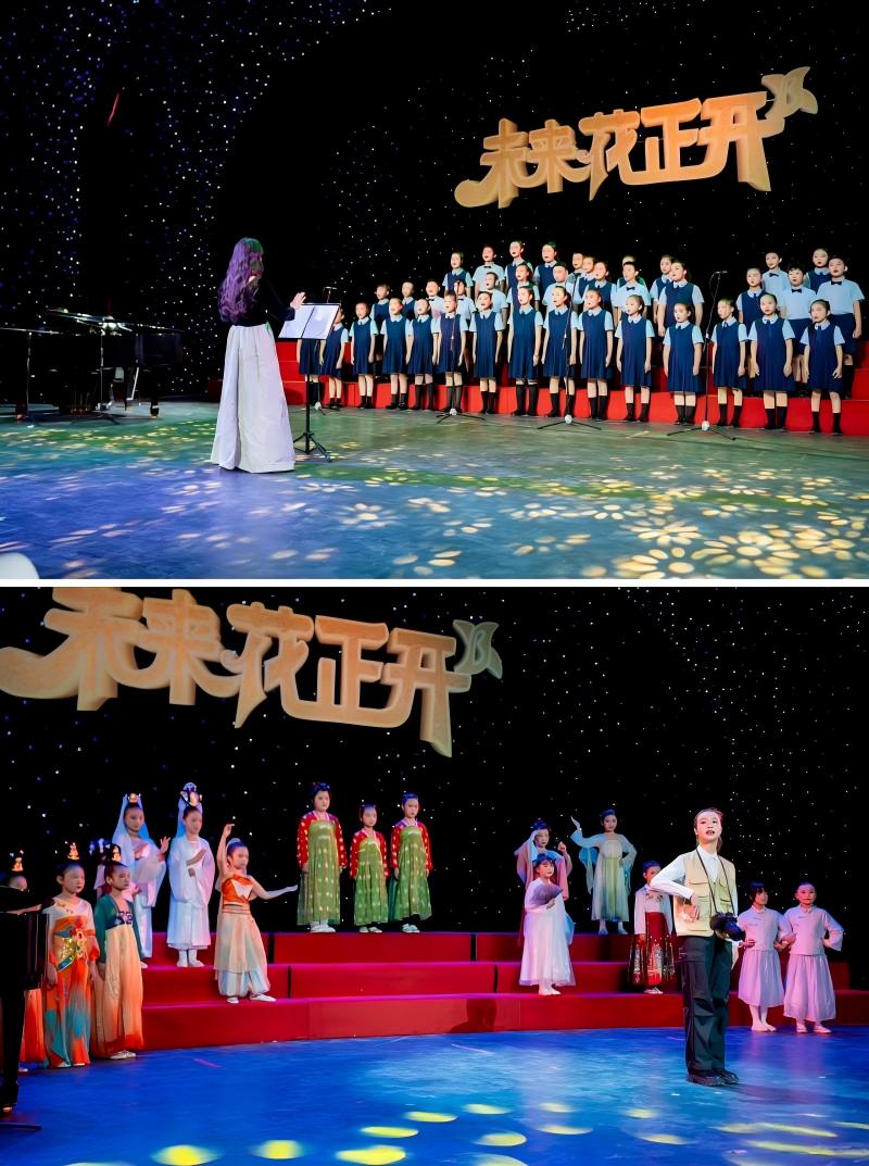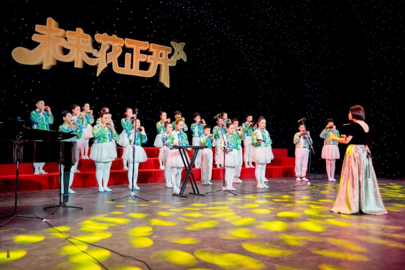 当日午后的梦幻剧场,星光璀璨、暖意融融。舞台中央悬挂着“未来花正开”主题字幕,两侧电子屏滚动着学校各项文体活动花絮,让现场提前浸满了童年的热烈与期待。15时整,随着主持人清脆的报幕声落下,绿莺陶笛坊的孩子们手持陶笛齐奏《七色光之歌》,清亮的乐声如春日溪流淌过剧场,正式拉开了音乐会的帷幕。