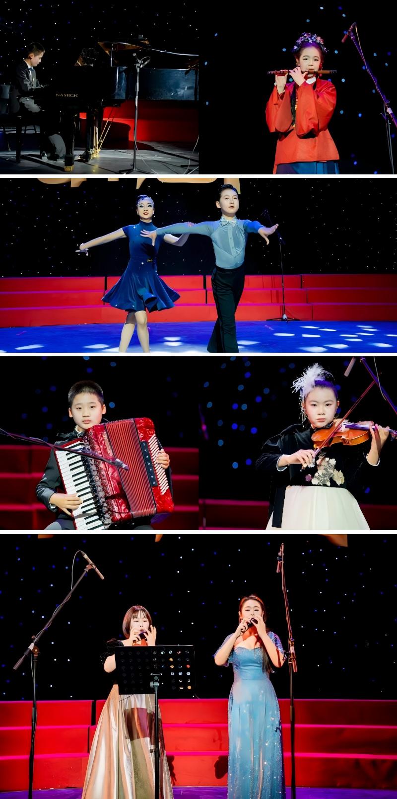 第二篇章“自学生长・雅韵传”中,绿莺陶笛坊的《跃动音浪・漫享时光》以多声部陶笛合奏惊艳全场,高低音交错间,仿佛能看见少年们在艺术课堂里的专注与热爱;添翼合唱团接连献上《声声慢》《江畔独步寻花》,钱晓慧老师指挥的手势起落间,古典诗词的韵律与现代合唱的柔美相融,让千年文脉在童声中流转;《五彩旋律・逐光而行》里,王全屹等五位同学的器乐重奏,更是以灵动的转调与默契的配合,展现了校园艺术社团的专业底色。