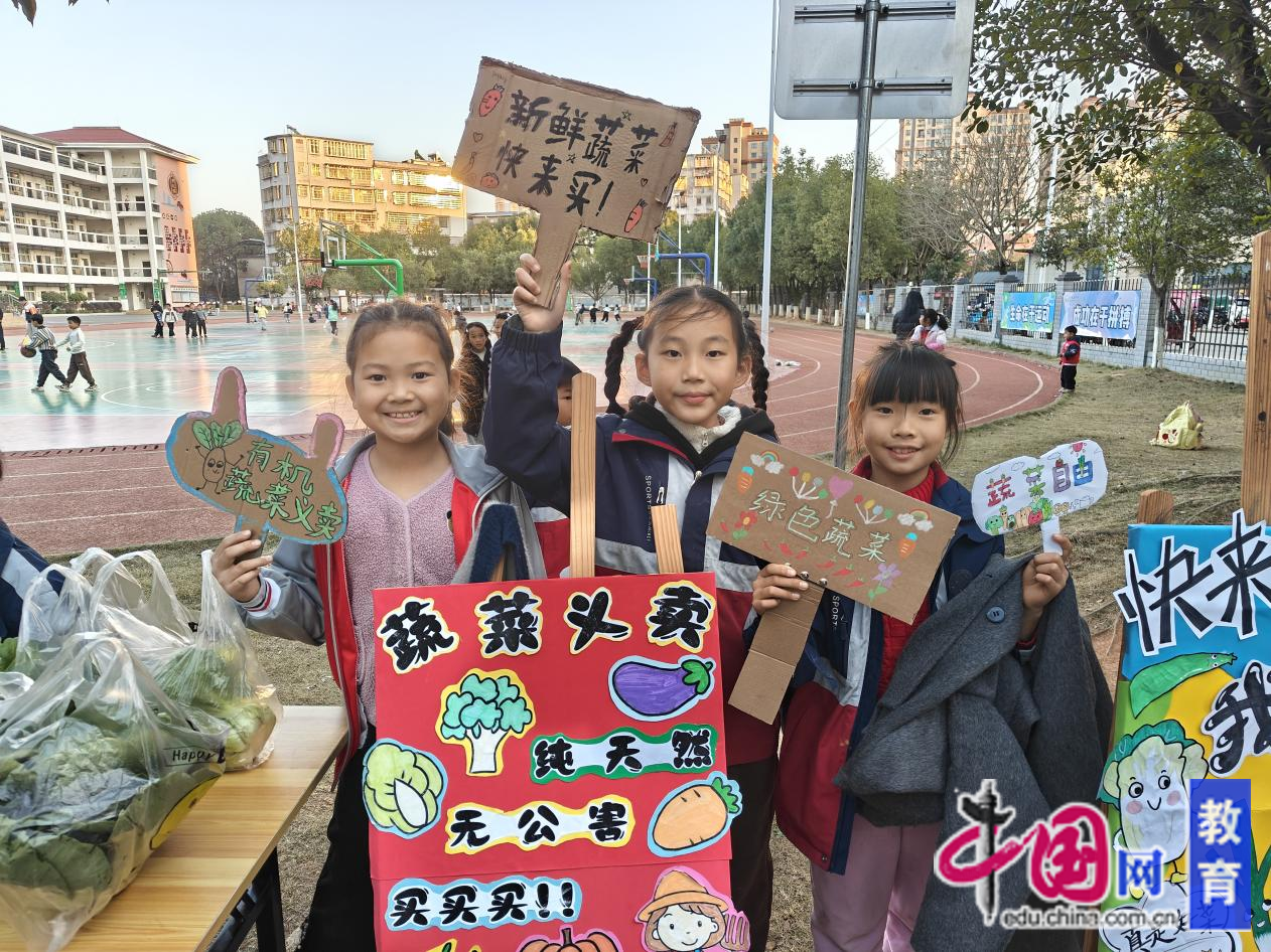 从秋种到冬收,上海青、白萝卜等时令蔬菜都是孩子们浇水、施肥、除草的劳动结晶。为了让劳动教育走出田间、走进生活,学校以“蔬菜+义卖”为模式,让劳动实践伸至校园市集,让学生在亲身参与中体悟“一份耕耘,一份收获”的深刻内涵。