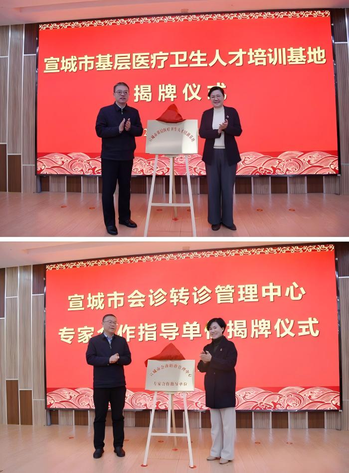 夏劲松与何淳宽共同为“宣城市基层医疗卫生人才培训基地”揭牌;贾贤燕与杨文武共同为“宣城市会诊转诊管理中心专家合作指导单位”揭牌。两项揭牌标志着校地医疗协作与基层人才培养进入机制化、平台化新阶段。