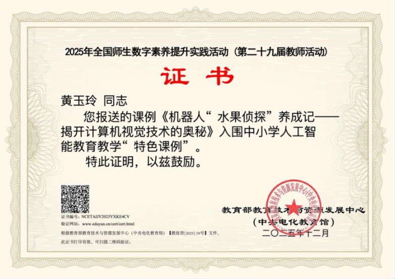 此外,黄玉玲老师撰写的论文《数智赋能驱动下信息科技课程的跨学科融合教学设计与实践验证》在2025年度教育技术论文活动中荣获“入围论文”国家级荣誉。该论文以生成式人工智能等技术为支撑,构建了“数智赋能驱动下信息科技跨学科融合教学”实践框架,提出了三层协同机制与多角色智能体设计模型,为教育数字化转型提供了具有参考价值的实践路径。