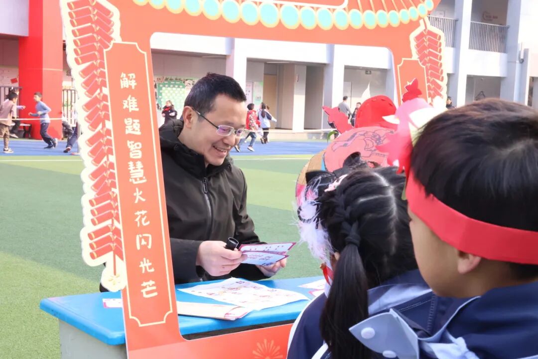 一年级的孩子们头戴亲手制作的马年、新年主题头饰,化身“小骏马”与“福娃”,欢快地穿梭于语文与数学两大闯关赛道。数学赛道设有“鞭炮乐算坊”“灯笼数谜会”“福字图形屋”“年货妙算集”等关卡。孩子们在鞭炮串中计算,在灯笼图案里解谜,在观察与思考中运用数学知识。每闯一关,便收获一枚福袋贴纸,喜悦洋溢在一张张笑脸上。