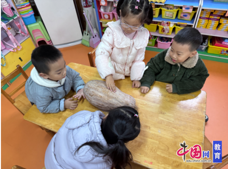画完南瓜,真实的“南瓜朋友”登场了。老师把圆滚滚的南瓜搬进教室,宝贝们立刻围上来:有的张开小胳膊试着“抱一抱”,感受南瓜沉甸甸的分量;有的伸出小手轻轻“摸一摸”,叽叽喳喳分享发现:“它的皮有点硬!”“这里还有一条小纹路呢!”亲密互动中,宝贝们对南瓜的好奇更浓了。