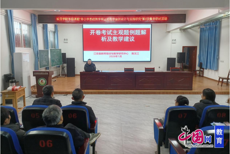 为推动课题研究走深走实,促进成果向教学实践有效转化,1月14日,宜宾市江安县阳春镇长江学校市级课题“中小学思政跨学科主题教学案例设计与实践研究”第8次集中研讨活动在该校阶梯教室举行。本次活动聚焦“开卷考试能力培养与跨学科思维融合”主题,江安县教师培训与教学研究中心副主任、课题主研人员陈文江作专题指导,课题组全体成员及部分骨干教师参与研讨。