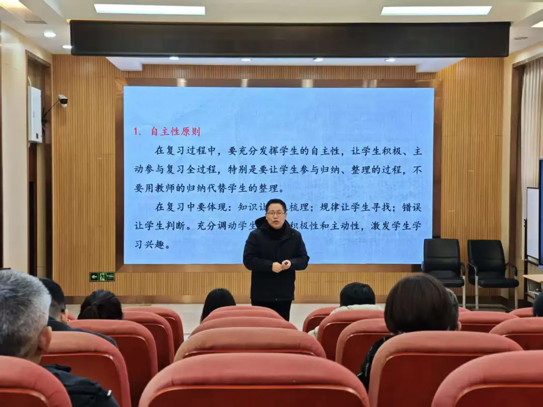 结合期末复习实际,赵校长提出复习三原则:自主性原则鼓励学生主动梳理知识;针对性原则要求聚焦薄弱环节、易错点和易混淆点设计训练;系统性原则则强调构建完整知识体系。他进一步拆解复习五步骤,明确“忆、梳、析、练、测”的实施路径,重申期末复习需坚持“以课堂为主、以课内为主、以能力为主”的核心导向。