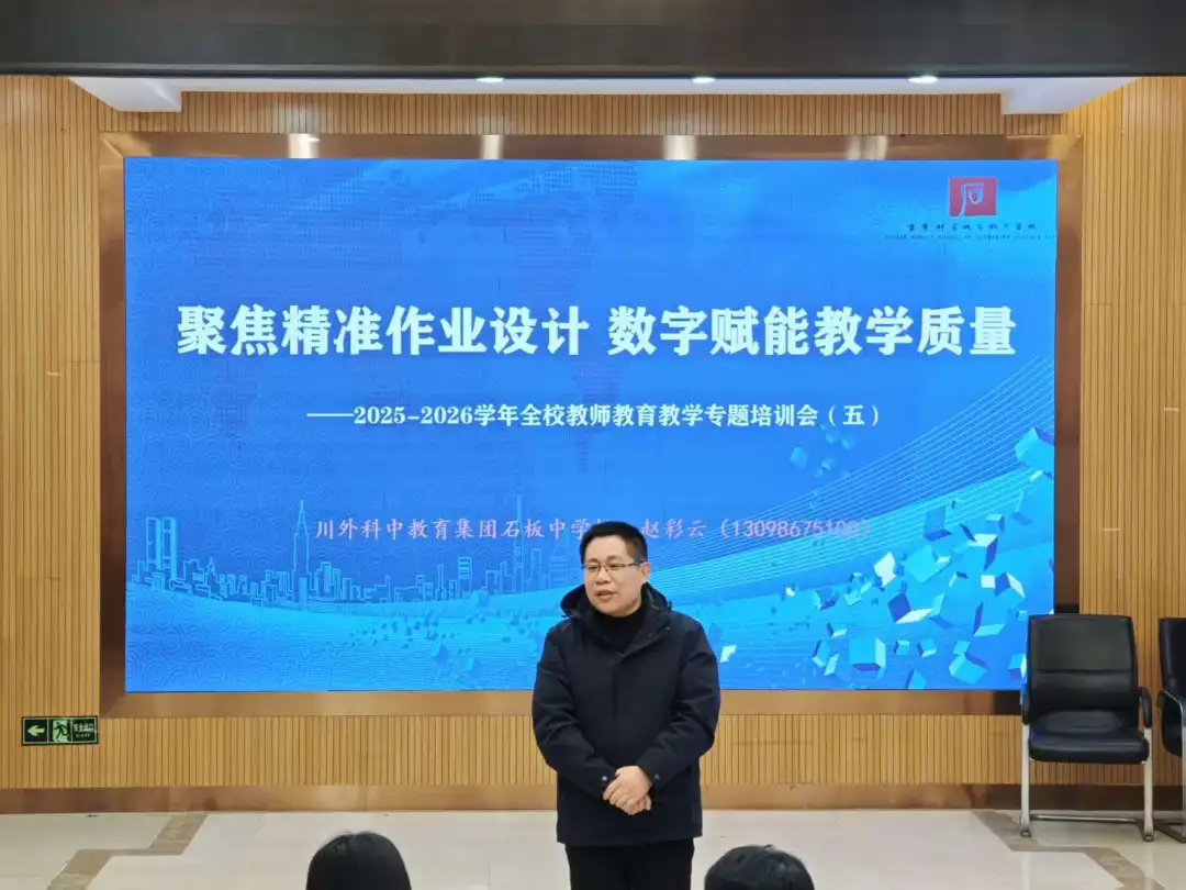 为深化教学改革,发挥数字平台优势,推动精准作业数字平台高效落地,2026年1月13日下午,重庆科学城石板中学校书记、校长赵彩云面向全体教职工,开展了“聚焦精准作业设计,数字赋能教学质量”主题讲座,为期末教学工作指明方向。