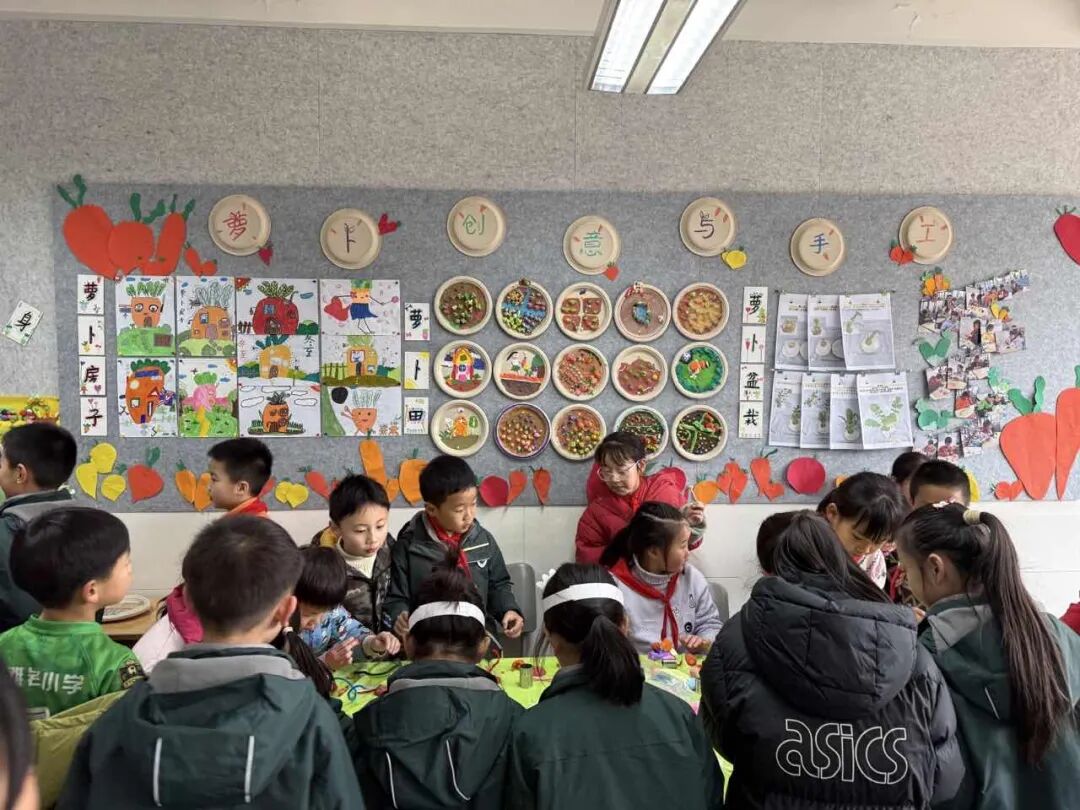 萝卜不仅是食材,更是艺术的玩具。一(4)班创编《法语萝卜歌》,二(1)班制作栩栩如生的萝卜手工,二(4)班创作萝卜漫画,二(6)班开发萝卜游戏,二(3)班、二(5)班设计萝卜转盘答题游戏,四(2)班开展妙手雕萝卜制作印章,四(1)班用超轻粘土制作萝卜美食,四(4)班准备创意萝卜签文送祝福,三(1)班、三(7)班在腌制中品味传统美学,一(1)班、一(2)班和一(5)班萝卜小报生动有趣、童趣十足,五(5)班则以萝卜家书形式进行创意表达。在这里,萝卜成为表达美的语言,孩子们在创作中玩出生活之美。