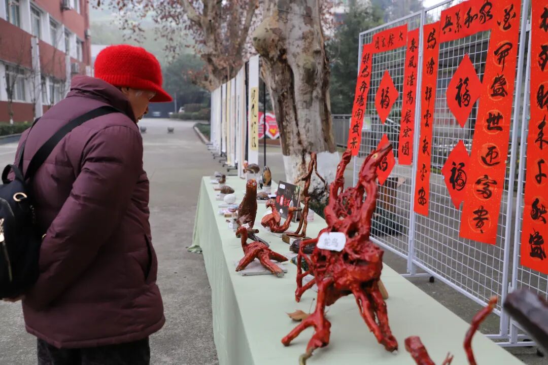 水土小学“少儿彩绘”的斑斓童趣、九龙山小学“黑白画印”“儿童版画”的质朴匠心,尽显学校特色项目的蓬勃生机;与退休教师书法展的笔墨书香交相辉映;根雕作品的自然肌理、现场书写春联的年味暖意、竹编展示的指尖巧思,让“统一规划,自主开发,分校实施”的特色发展原则具象化呈现,更彰显了“分层推进,以点带面,全面开花”的育人格局。