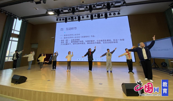 在互动教学环节,黄子彧为师生挑选了《东窗修本》节选,耐心地教同学们练习唱腔与基础身段。他逐字逐句示范,纠正发音与姿态,同学们热情高涨,跟着小老师一字一句学唱,一招一式模仿,校园里回荡着悠扬的川剧旋律,传统文化的种子在欢声笑语中悄然萌芽。