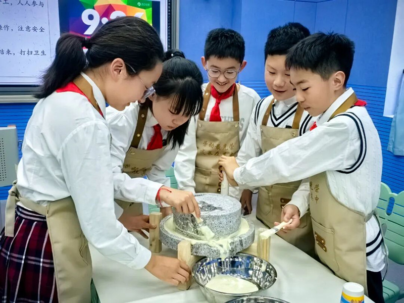学校对劳动教育进行系统规划,在保证每周一节劳动课的基础上,将传统文化融入课程体系。例如,组织学生在端午节体验包粽子、在中秋节尝试制作月饼、在冬至体验包饺子,带领学生制作豆浆等,让他们在亲身参与习俗劳动中感受传统文化魅力。