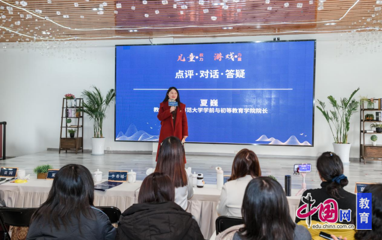 西华师范大学学前与初等教育学院院长、教授夏巍深入聆听专题分享,沉浸式观摩游戏现场后,夏教授肯定了市实幼的师生共构和师幼共构,感叹到幼儿园的每一处都把一种自然的绿融入到了各个角落当中,她肯定了三生教育中体现幼儿真正的自主性、愉悦性和自然生长性,以高屋建瓴的视角对现场活动进行了深度点评与专业引领。她指出,深度学习要有对话性、自主性、投入性等特点,总结了作为老师如何去支持孩子的深度学习,应该“破五唯,立五维”,要有他者思维、跨界思维、证据思维、设计思维、批判思维。她还强调,教育不仅要关注孩子,还要呼吁社会各界对教师的关注,因为孩子们的深度学习,离不开教师的真心、关心、爱心和奉献,真正热爱这份职业的人、为幼教事业发光发热的人,才是大家最深度的学习。