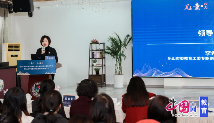 李希瑶发表致辞,充分体现了乐山市委教育工委和市教育局对本次活动的高度重视与大力支持,李希瑶对各位专家和幼教同仁表达了热烈的欢迎和诚挚的感谢,并从陶行知先生“生活即教育”“知行合一”的教育理念与乐山这座教育之城气质的深度契合点出发,具体介绍了近几年乐山市学前教育这项民生工程的发展与举措。她提出,在乐山学前教育高质量发展的征程中,陶研会为大家搭建了交流互鉴的优质平台,市实幼作为分会场也分享了优质实践经验,面向未来,大家仍需凝心聚力、深耕不辍:一是坚守初心使命,让游戏权利真正落地;二是深化实践探索,让游戏质量持续提升;三是强化协同赋能,构建优质均衡幼教生态。持续深化改革创新,奋力推动乐山学前教育再上新台阶。