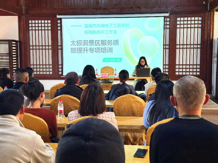近日,随着广德“三件套”火爆出圈,这座长三角几何中心的小城累成为近期文旅热点。太极洞景区为抢抓流量红利,破解大客流下的服务短板,邀请安徽广德技师学院培训中心赴景区开展“服务质量提升专项培训”。1月16日,培训中心委派陈娟娟名师工作室的两位骨干教师,为景区全体一线工作人员送上“定制化赋能课程”。