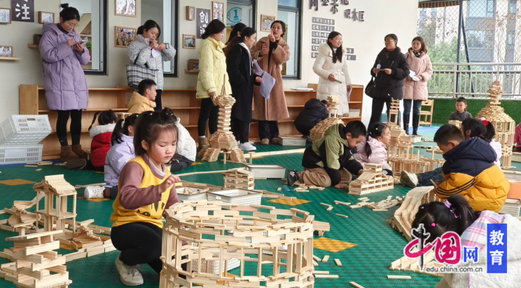 活动在温馨的签到中拉开序幕。淯江幼儿园业务园长万茜向与会教师介绍流程,并分发观察记录表,引导大家带着“发现的眼睛”走进各班级展示区。从小班的篮球操与体能循环、自然创意拼搭、磁力探索,到中班的粘土创作、大班的阿基米德积木建构……每个班级宛如一座“课程博物馆”,孩子们在自主游戏中专注探索、积极合作,展现出丰富的想象力和表达力。