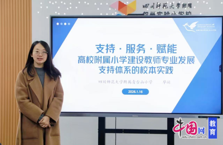 四川师范大学附属青台山小学校副校长毕运以《高校附属小学建设教师专业发展支持体系的校本实践》为题,聚焦教师专业发展,构建“五位一体”支持体系,以四阶五维成长标准为引领,打造教研培一体化校本研修路径,联动高校与区域资源搭建成长平台,通过多元评价与制度保障,形成教师成长良性循环,为学校高质量发展筑牢师资根基。