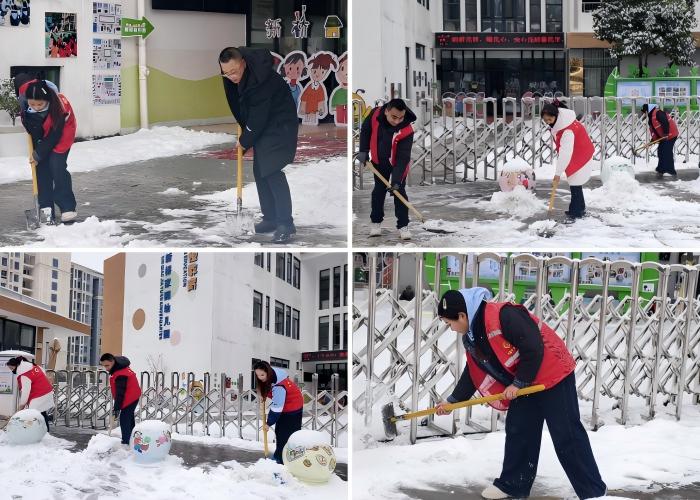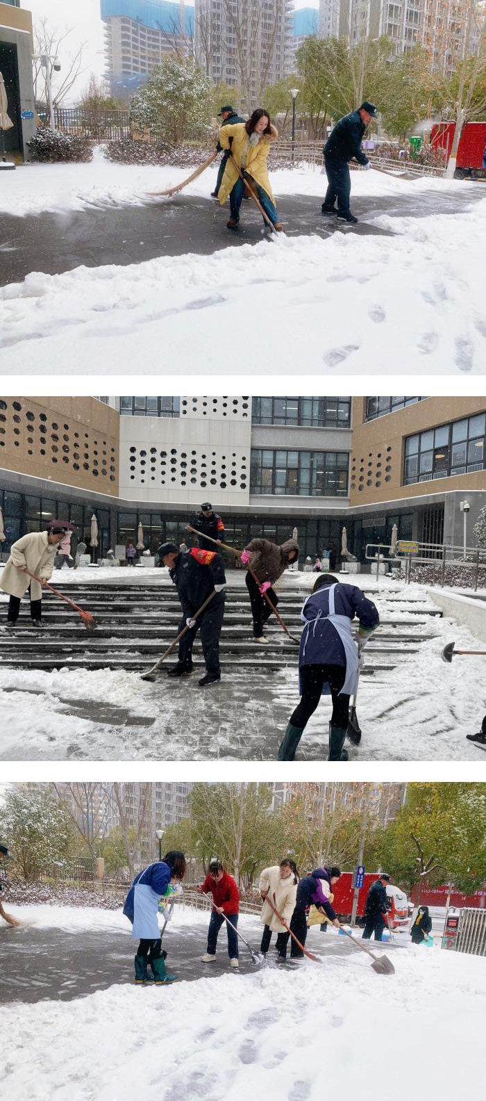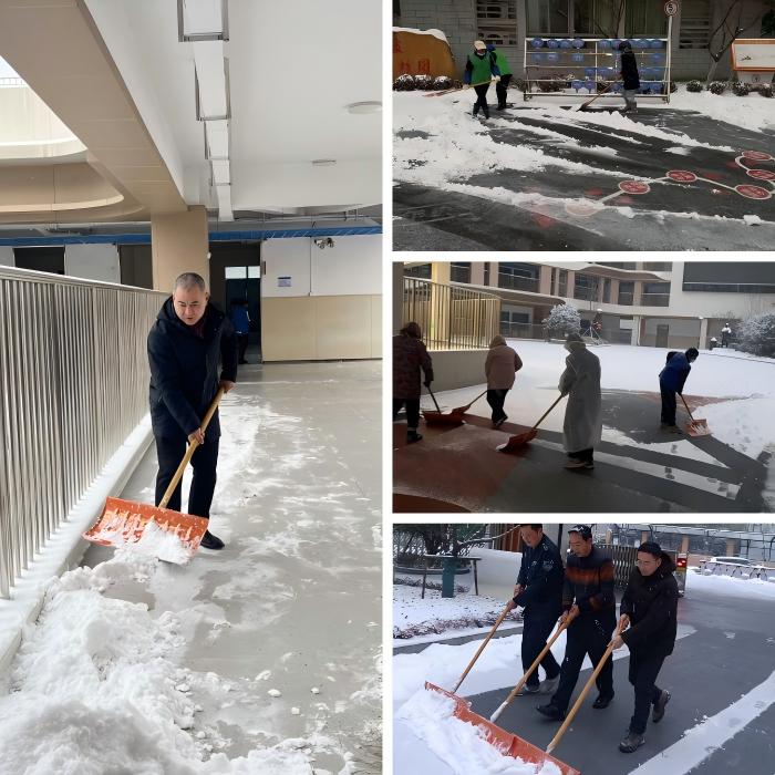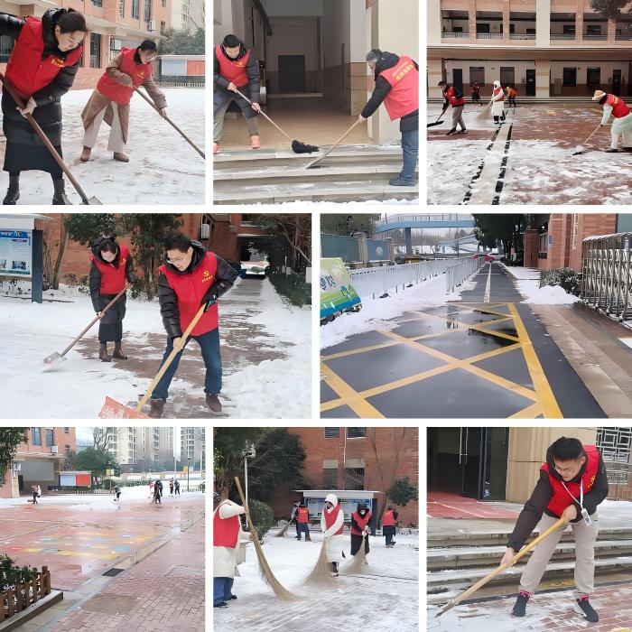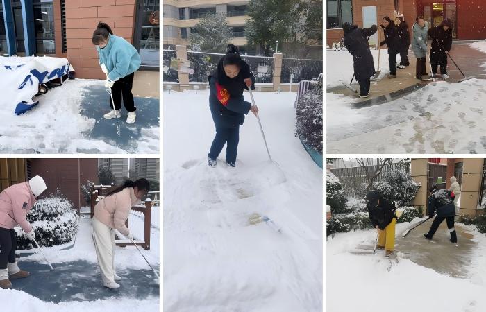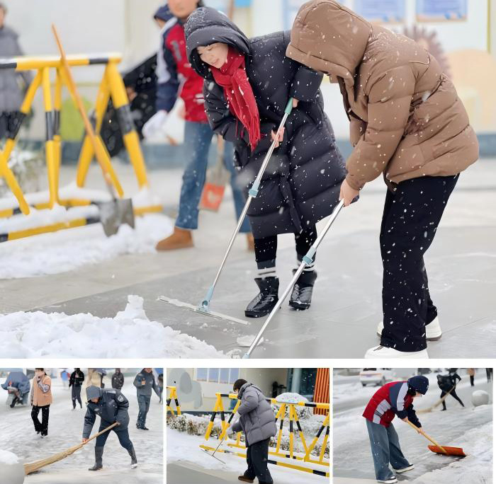 清晨的校园里,寒风凛冽却暖意涌动。各学校教职工率先垂范,党员干部冲锋在前,挥舞铁锹铲雪破冰,手持扫帚清扫浮雪,推着雪铲转运积雪,分工协作、干劲十足。从晨曦微露到日上三竿,校园内外到处是忙碌的身影,铁锹碰撞冰层的“咣当”声、扫帚清扫积雪的“唰啦”声,交织成冬日里最动人的“攻坚交响曲”。