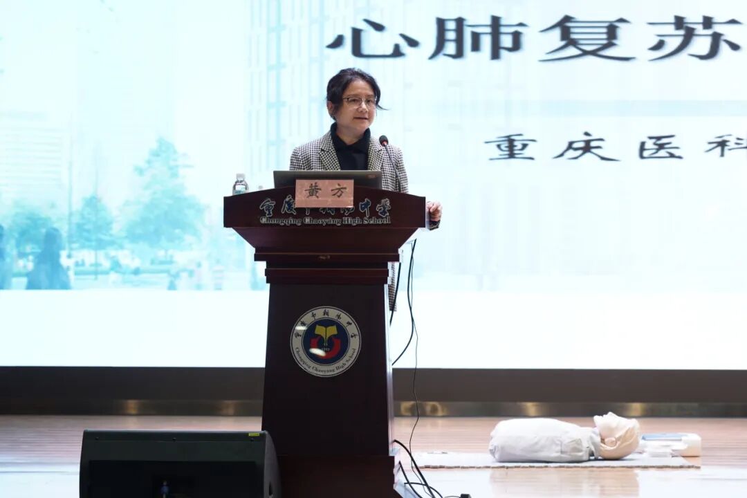 首先由重庆医科大学附属北碚医院急诊医学科副主任黄方授课,专家组结合校园高频应急场景,以真实案例切入,系统讲解心脏骤停识别、如何拨打120、心肺复苏(CPR)、AED使用及气道异物梗阻急救等核心技能。重点强调“黄金4分钟”施救原则,明确胸外按压5-6厘米深度、100-120次/分钟频率等关键标准,详解AED操作流程,以及气道梗阻“5次背部拍击+5次腹部冲击”2025年最新急救法,确保知识传递精准高效。
