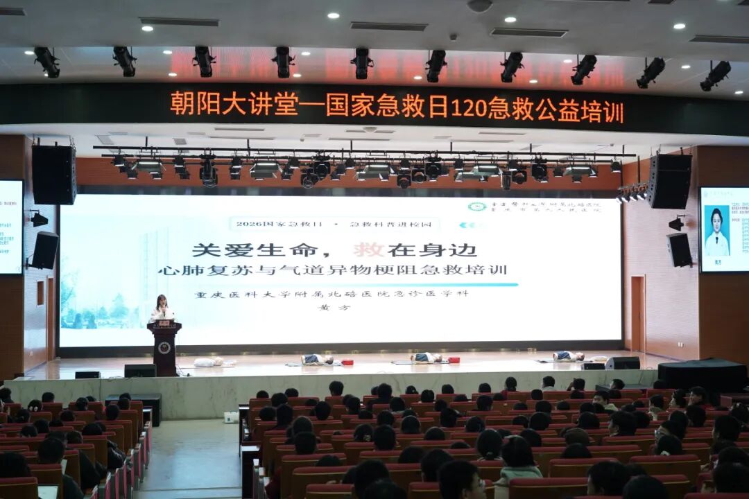 为响应2026国家急救日号召,落实重庆市“提升公众急救能力”民生实事,1月19日下午,重庆市朝阳中学校特邀重庆医科大学附属北碚医院急诊医学科专家组,在树人报告厅开展朝阳大讲堂第62期,关于应急救护培训与实操演练。全校各班安全员,全体班主任、宿管老师、安保人员共计500余人全程参与,活动由学校德育主任谢伊伊主持。