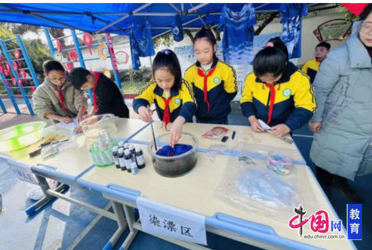 扎染区展示着学生制作的扎染方巾、衬衫等作品,让老师们直观感受扎染技艺的独特魅力。拓印区,同学们的拓印作品创意十足,现场展示环节更让老师们近距离领略了传统技艺的趣味与韵味。桂花茶展区不仅展示了桂花绿茶的配置包装,还现场让老师们品尝桂花绿茶的芳香。一些老师感慨道:“现场演示太直观了,这对今后开展类似课程很有启发。”