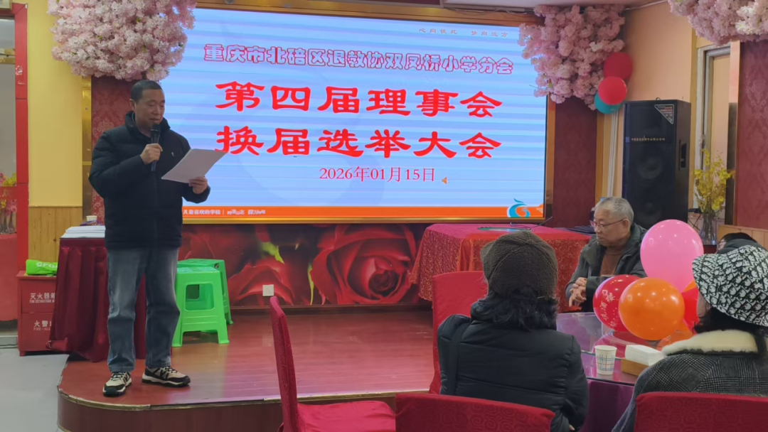 蜡梅初绽,岁月含情。2026年1月15日至16日,重庆市北碚区退教协双凤桥小学分会第四届理事会换届选举大会在大家的期待中圆满举行。全校229名退休教职工参与盛会,共同见证这场承载着责任与传承的换届盛事。