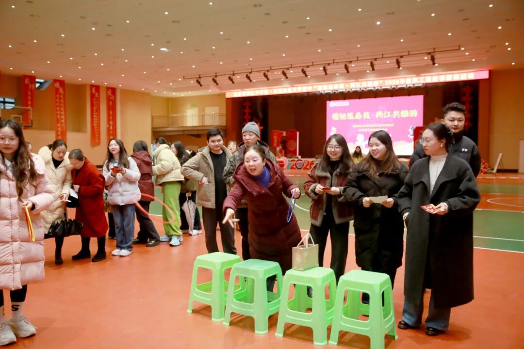 岁末暖冬,喜乐相逢。1月20日下午,重庆市两江中学校体艺馆内张灯结彩、暖意融融,由校工会精心筹备的“骏驰巡春苑•两江共雅游”2026教职工迎新春游园活动圆满落幕。全体教职工暂别忙碌的工作,沉浸式解锁趣味游戏,在欢声笑语中定格岁末美好,共话新春期许。