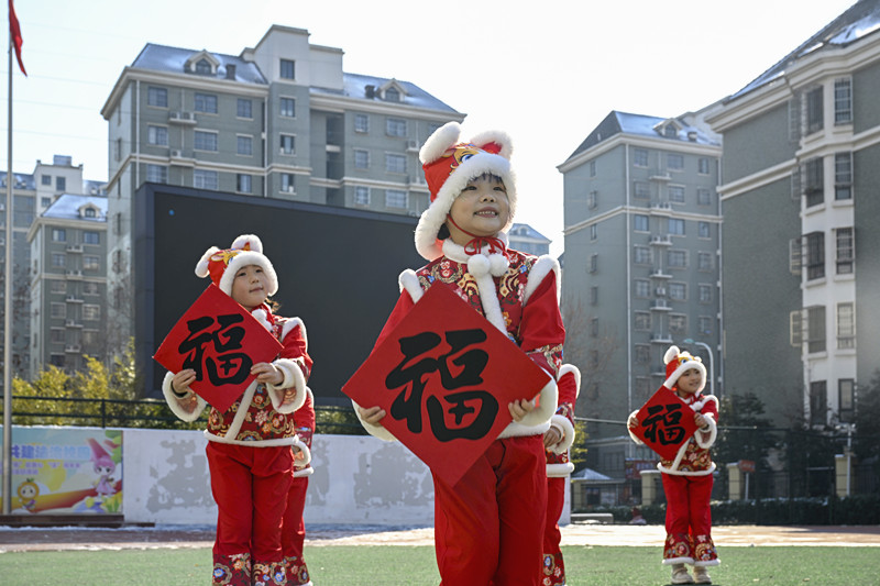 活动伊始,身着红色服装的学生按指定路线有序入场,校园里循环播放着《喜洋洋》《春节序曲》等新春民乐,处处洋溢着喜庆的节日氛围。表演区内,二年级学生代表手持福字道具,演绎福字主题舞蹈《福气要来到》,挥福、摆福、拼福的创意造型与欢快旋律相映成趣。