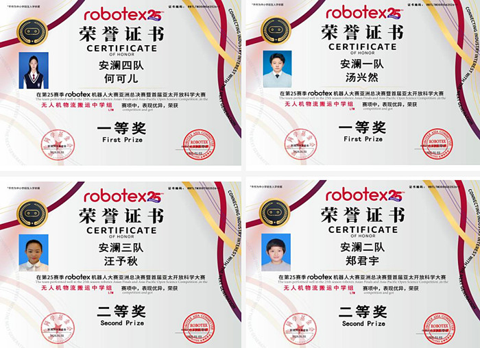 这次比赛中,学校704班何可儿和 905班汤兴然两人在无人机物流搬运初中组比赛中,分别获得大赛一等奖;702班汪予秋和703班郑君宇在无人机物流搬运初中组比赛中,分别获得大赛二等奖。