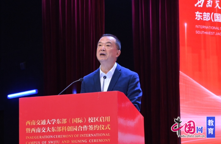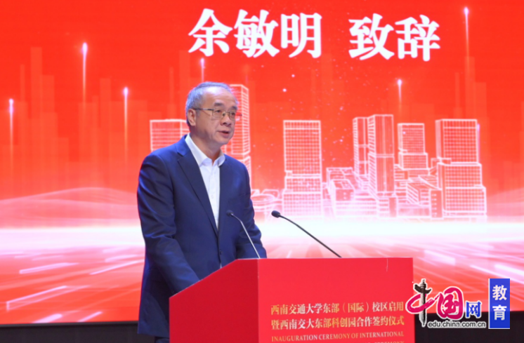 “成渝地区双城经济圈建设是党中央作出的重大战略决策,在成都市大力支持下,西南交大积极响应号召,聚合校地优势资源,携手共建东部(国际)校区和交大东部科创园,这是校地协同贯彻党中央重大决策部署的有力举措,也是学校探索教育科技人才一体发展的生动实践。”余敏明的致辞饱含深情与担当,他代表西南交通大学向关心支持东部(国际)校区规划建设的各级部门和社会各界表示衷心感谢。他表示,东部(国际)校区启用不仅是该校办学空间的战略性拓展,更是办学格局的历史性跃升,标志着西南交大“一校两地四校区”协同联动、一体发展的新格局正式形成。“全校上下要凝心聚力,将东部(国际)校区加快建设成为传承和弘扬‘交大’精神、吸引和培养拔尖创新人才、推进和扩大教育对外开放、孕育和产出重大原创成果的新高地,共同铸就欣欣向荣的东部(国际)校区,共同开创西南交大更加辉煌灿烂的明天。”